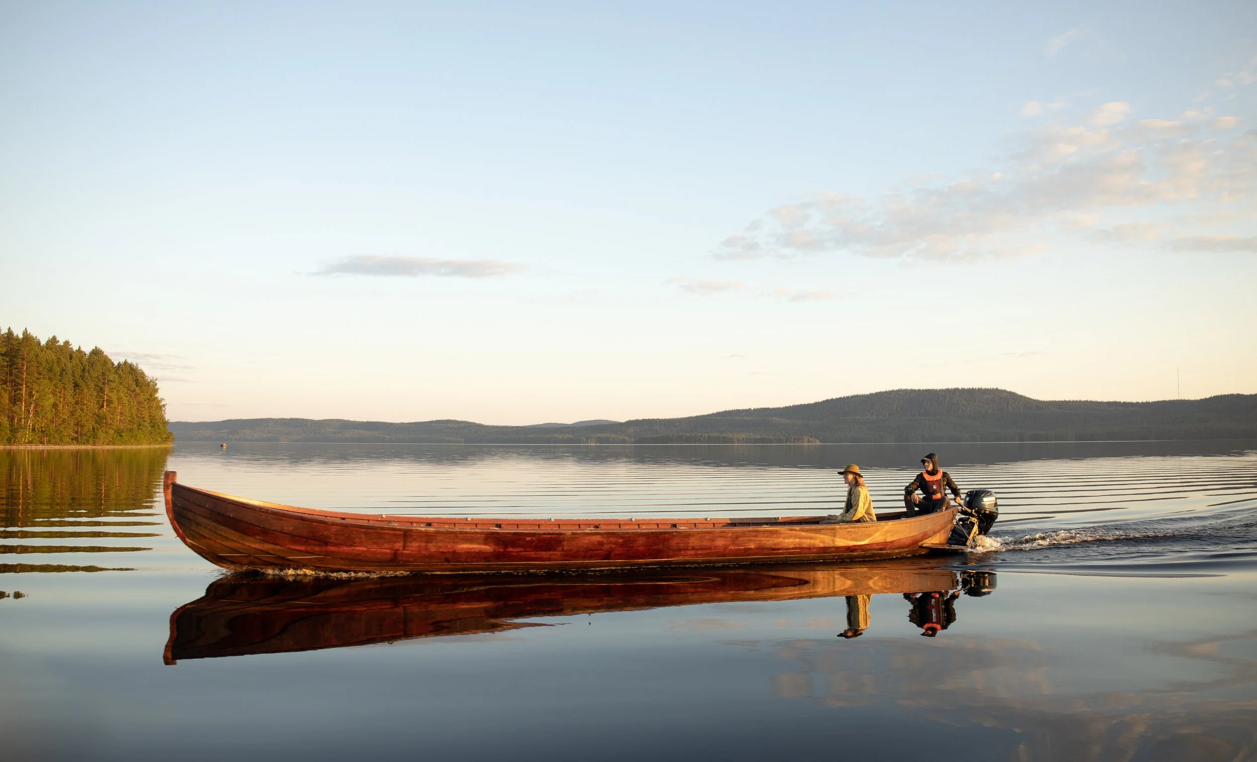 14-metrinen käsinveistetty kirkkoveneemme on valmistettu Nurmeksessa, ja nykyisin airojen sijaan matka kulkee moottorin avustuksella. Tyynellä kelillä saatamme matkata saareen kirkkoveneellä, jota on myös ‘Pielisen limusiiniksi’ tituleerattu.